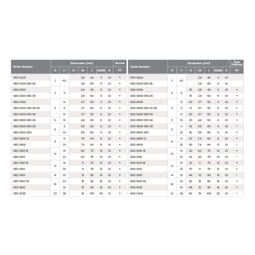 HPMT AL SE ENDMILLS, EDGE PROTECTION, FLUTE POLISHED, 2 FLUTES series G52/G53
