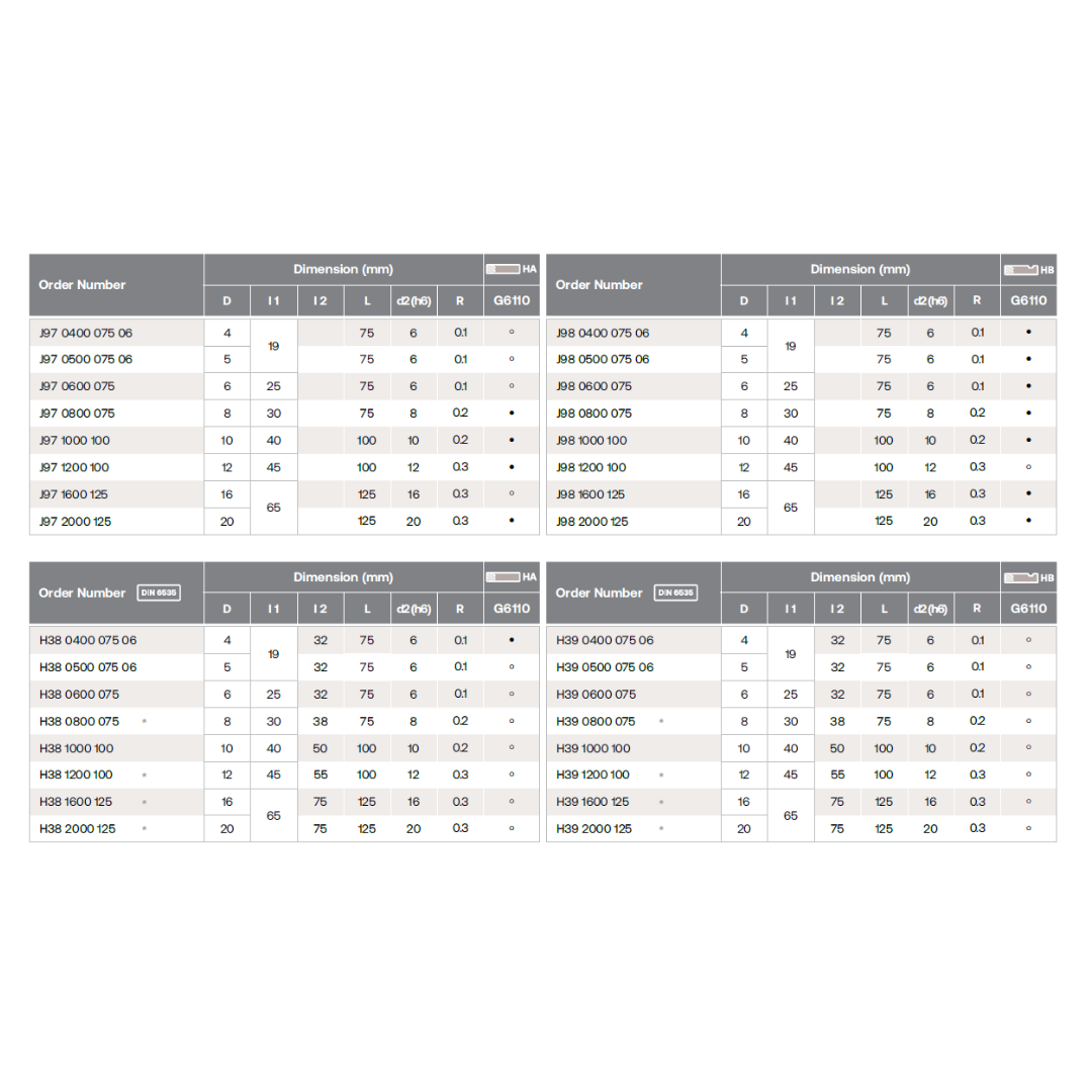 NITICO 30 DP/DH LONG ENDMILLS / WITH RECESS, 4 FLUTES series J97/J98/H38/H39