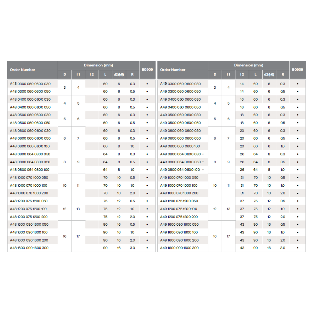 SE 60R TORUS ENDMILLS, SHORT FLUTES / WITH RECESS, 4 FLUTES series A48/A49