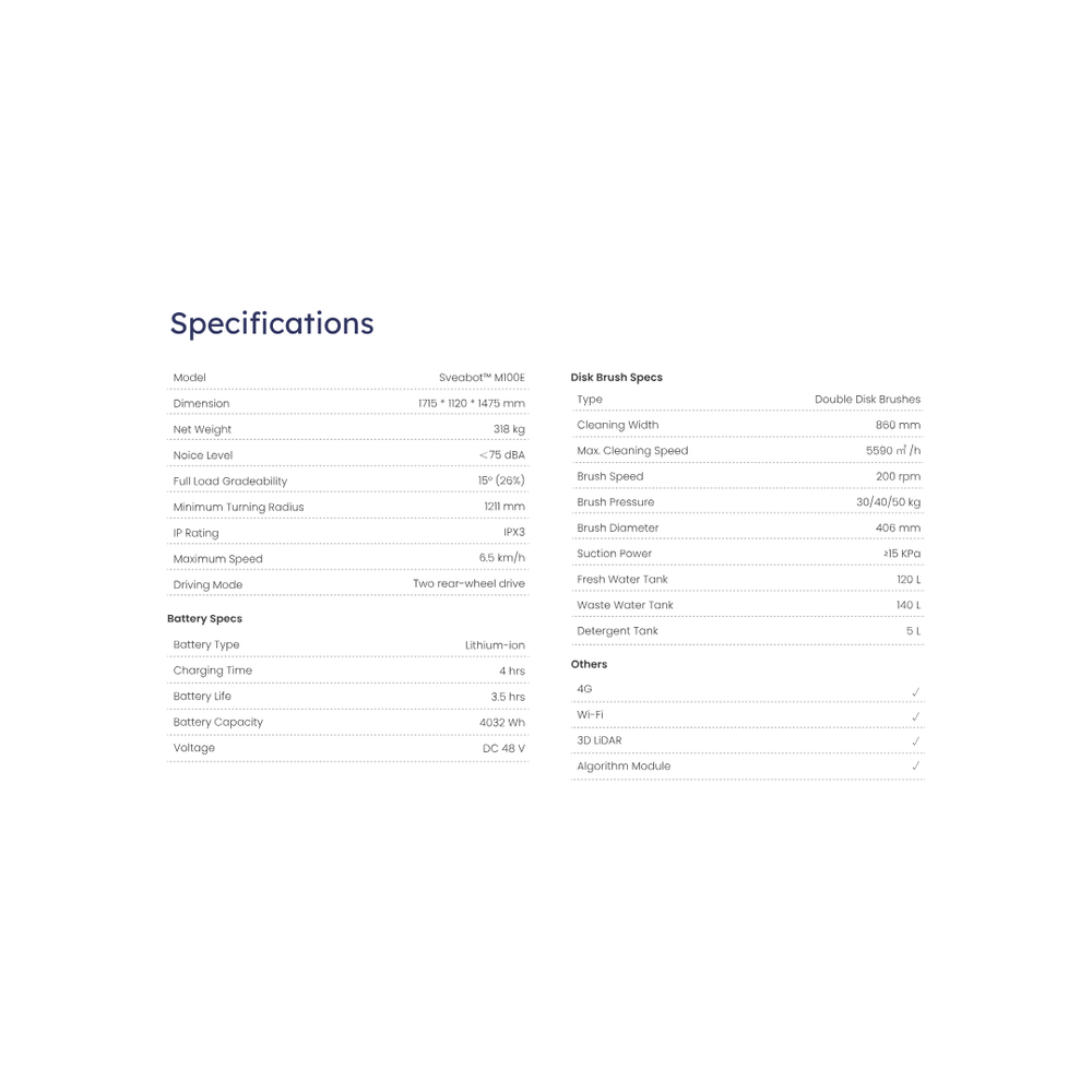 The Sveabot™ M100E is an autonomous floor scrubber designed for efficient commercial cleaning on 99% of floor surfaces. Equipped with 3D LiDAR, smart navigation, and dual cleaning modes, it delivers flexible, reliable, and cost-effective cleaning performance for businesses.